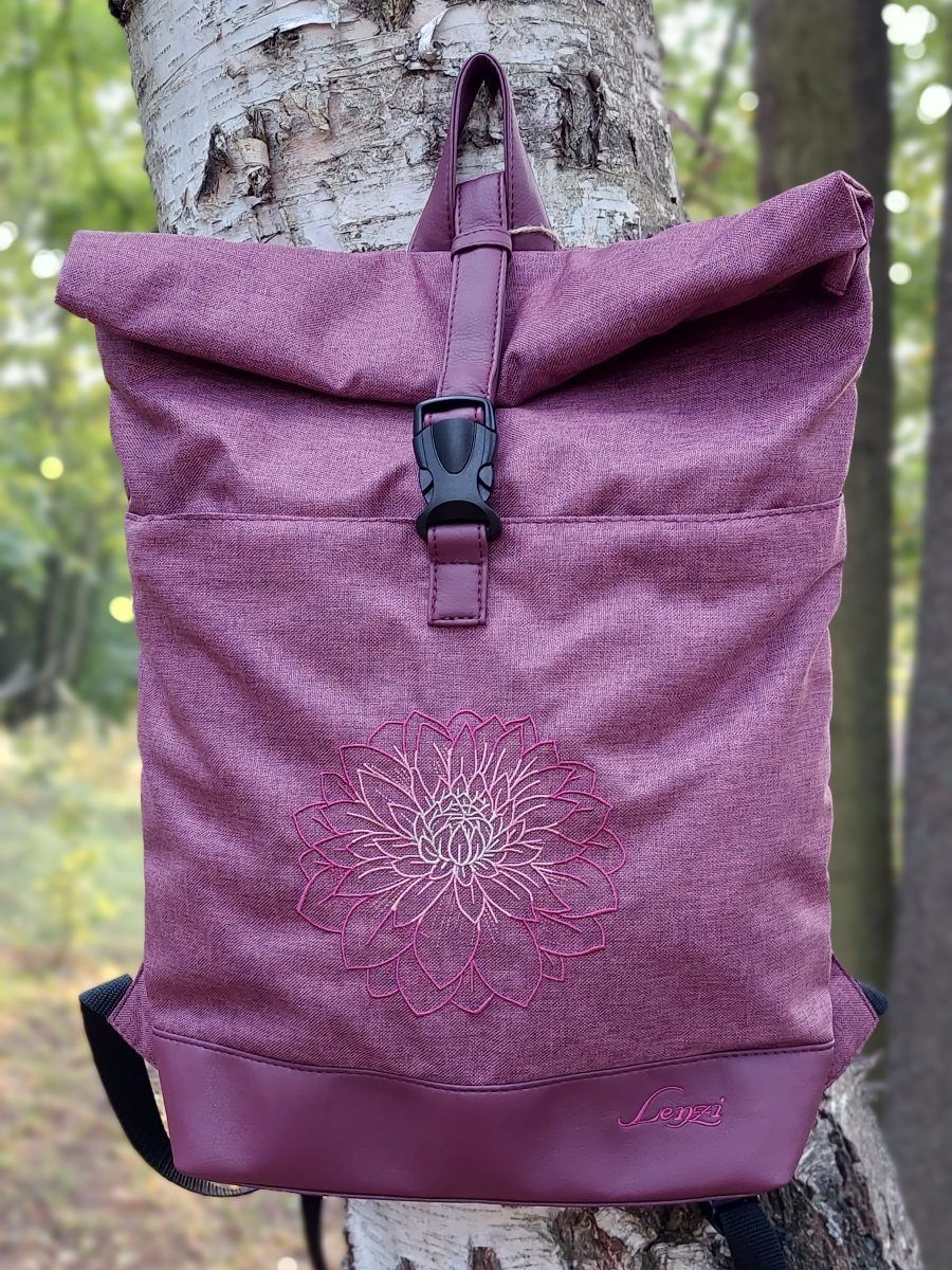 Rolovací batoh je vyroben melírové batohoviny v odstínu bordó s nepromokavým záděrem, krásně sedne na záda díky speciální výztuži. Výšivka je projasněna zlatou metalickou nití.
