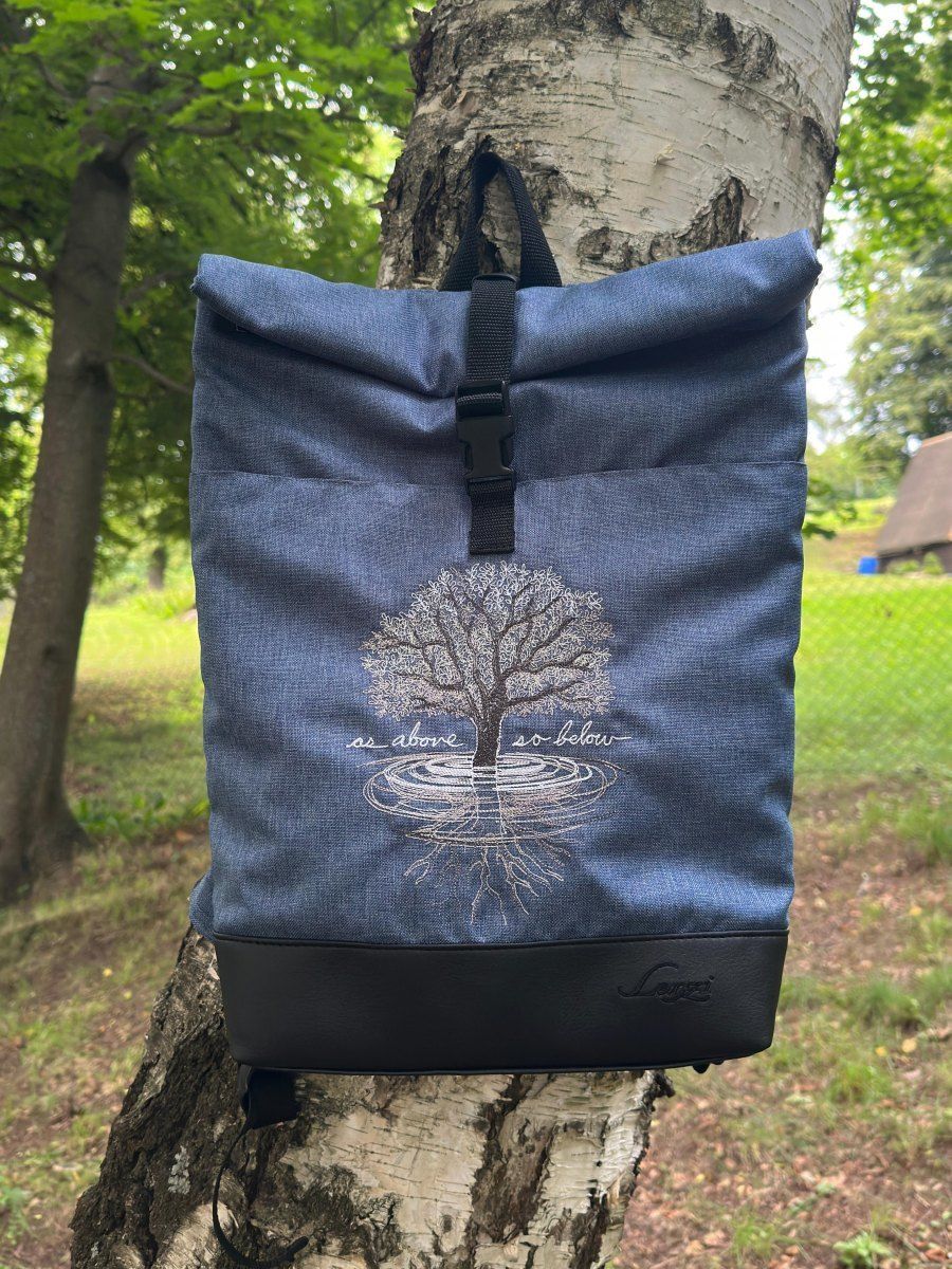 Rolovací batoh je vyroben melírové batohoviny v odstínu tmavě modré s nepromokavým záděrem, krásně sedne na záda díky speciální výztuži.