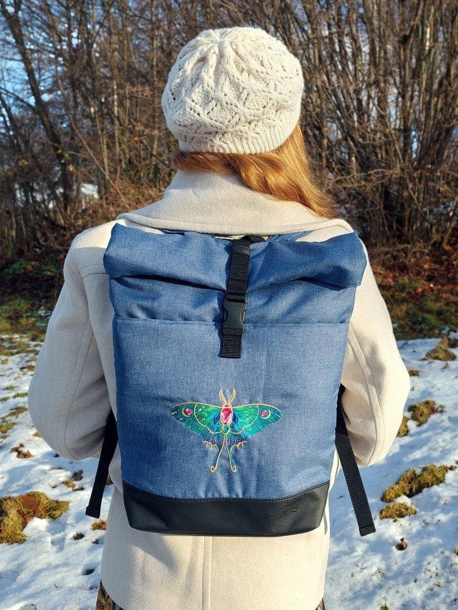 Rolovací batoh je vyroben melírové batohoviny v odstínu tmavě modré s nepromokavým záděrem, krásně sedne na záda díky speciální výztuži.