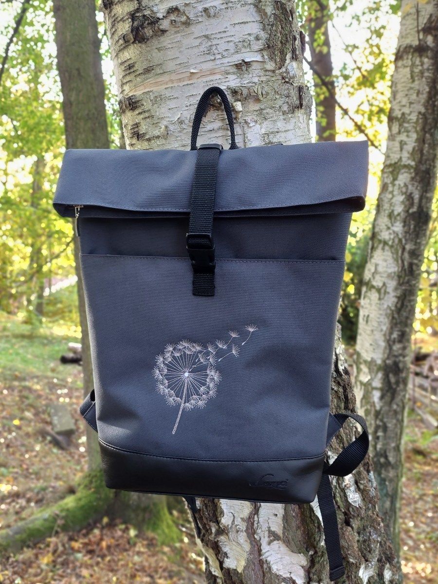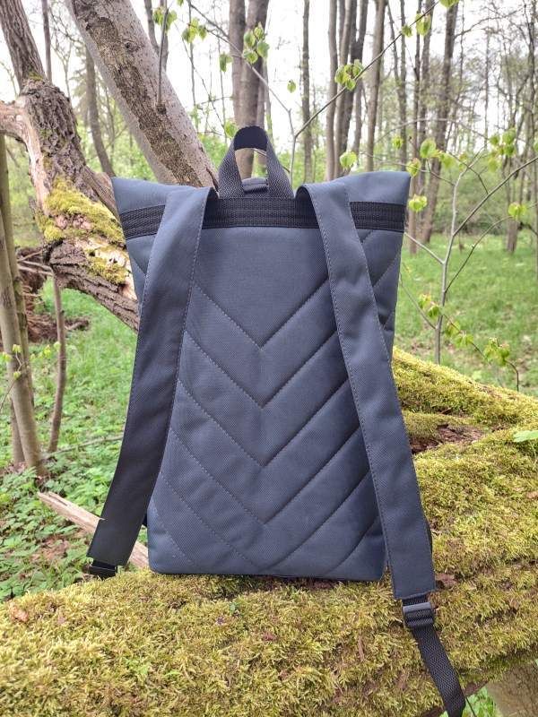 Rolovací batoh je vyroben z tmavě šedé pevné batohoviny s vodním sloupcem 3500 mm s koženkovými doplňky, krásně sedne na záda díky speciální výztuži.