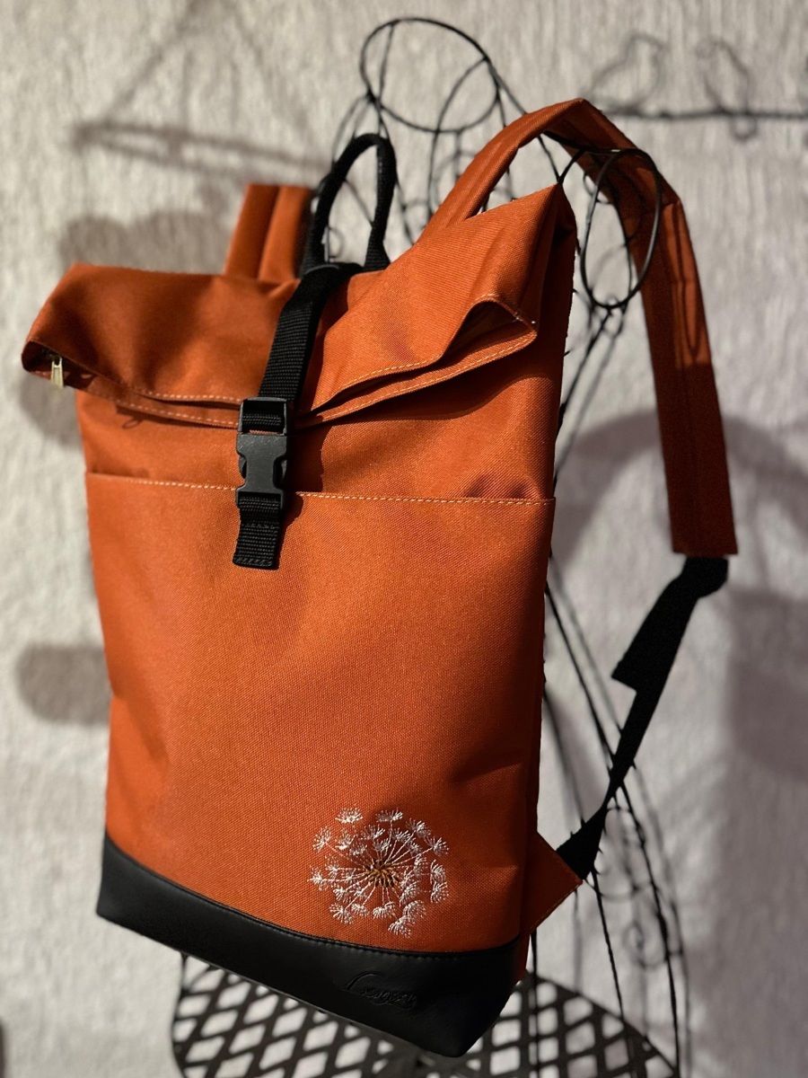 Rolovací batoh je vyroben ze skořicové pevné batohoviny s vodním sloupcem 3500 mm s koženkovými doplňky, krásně sedne na záda díky speciální výztuži.