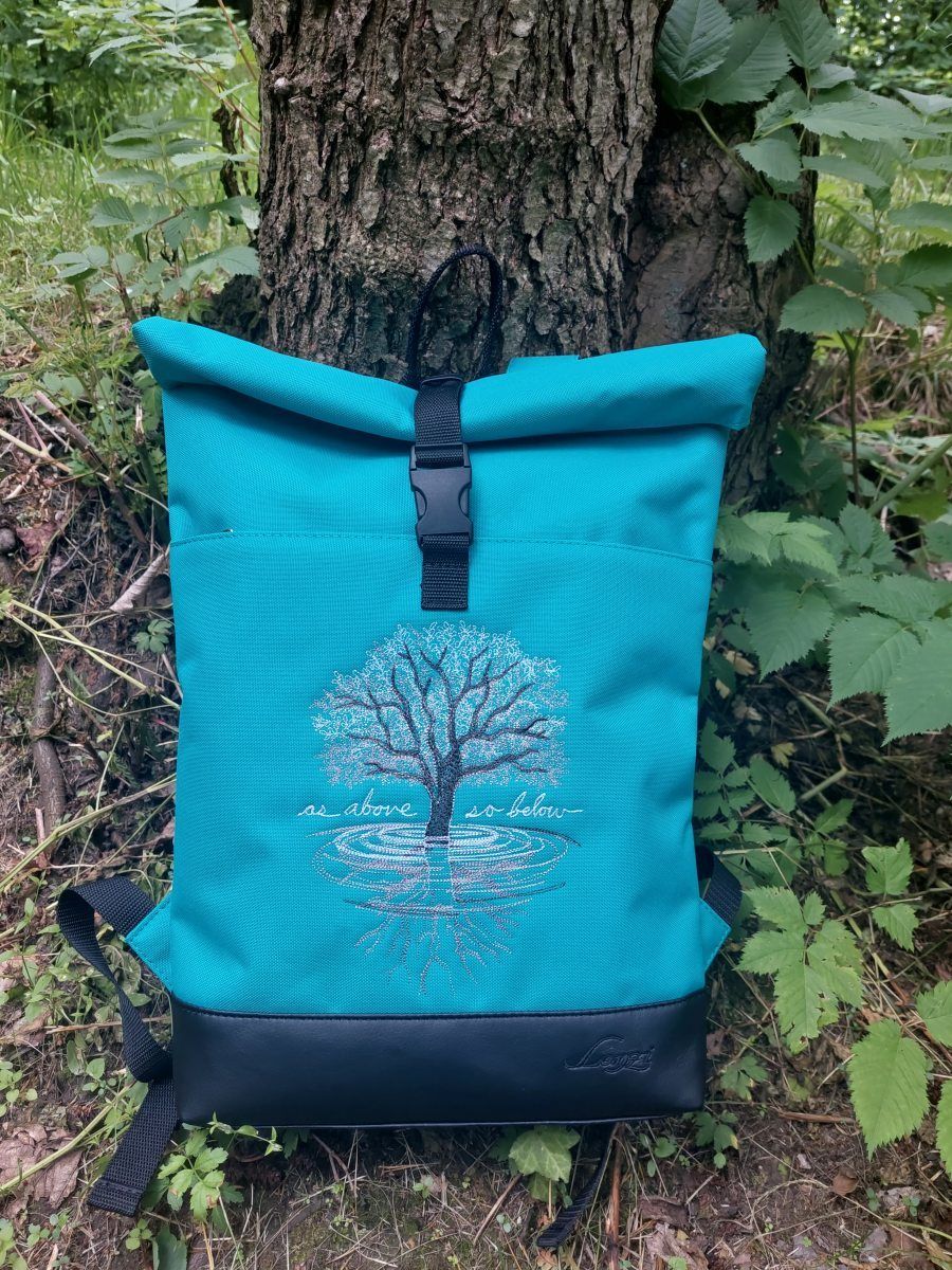 Rolovací batoh je vyroben z tyrkysové pevné batohoviny s vodním sloupcem 3500 mm s koženkovými doplňky, krásně sedne na záda díky speciální výztuži.