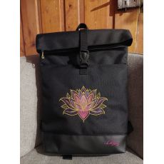 Rolovací batoh je vyroben z černé pevné batohoviny s vodním sloupcem 3500 mm, krásně sedne na záda díky speciální výztuži. Výšivka je zvýrazněna zlatou metalickou nití.