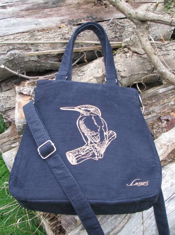 Vrchní díl kabelky je z tmavě modrého manšestru. Kabelka má zapínání na zip, vejde se do ní formát A4. Na zadní části je z venku zipová kapsa.