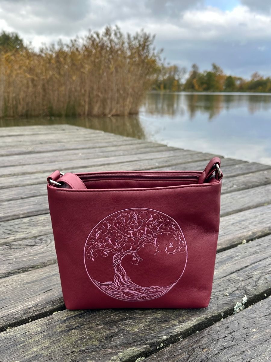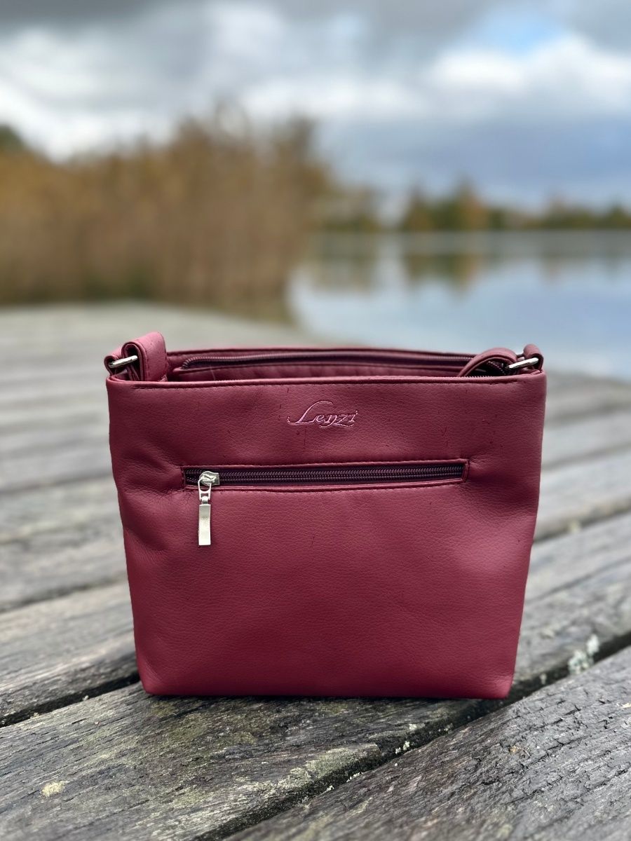 Kabelka je vyrobena z kvalitní jemné bordó koženky, má zapínání na zip, kapsičku na zip na zadním díle kabelky.