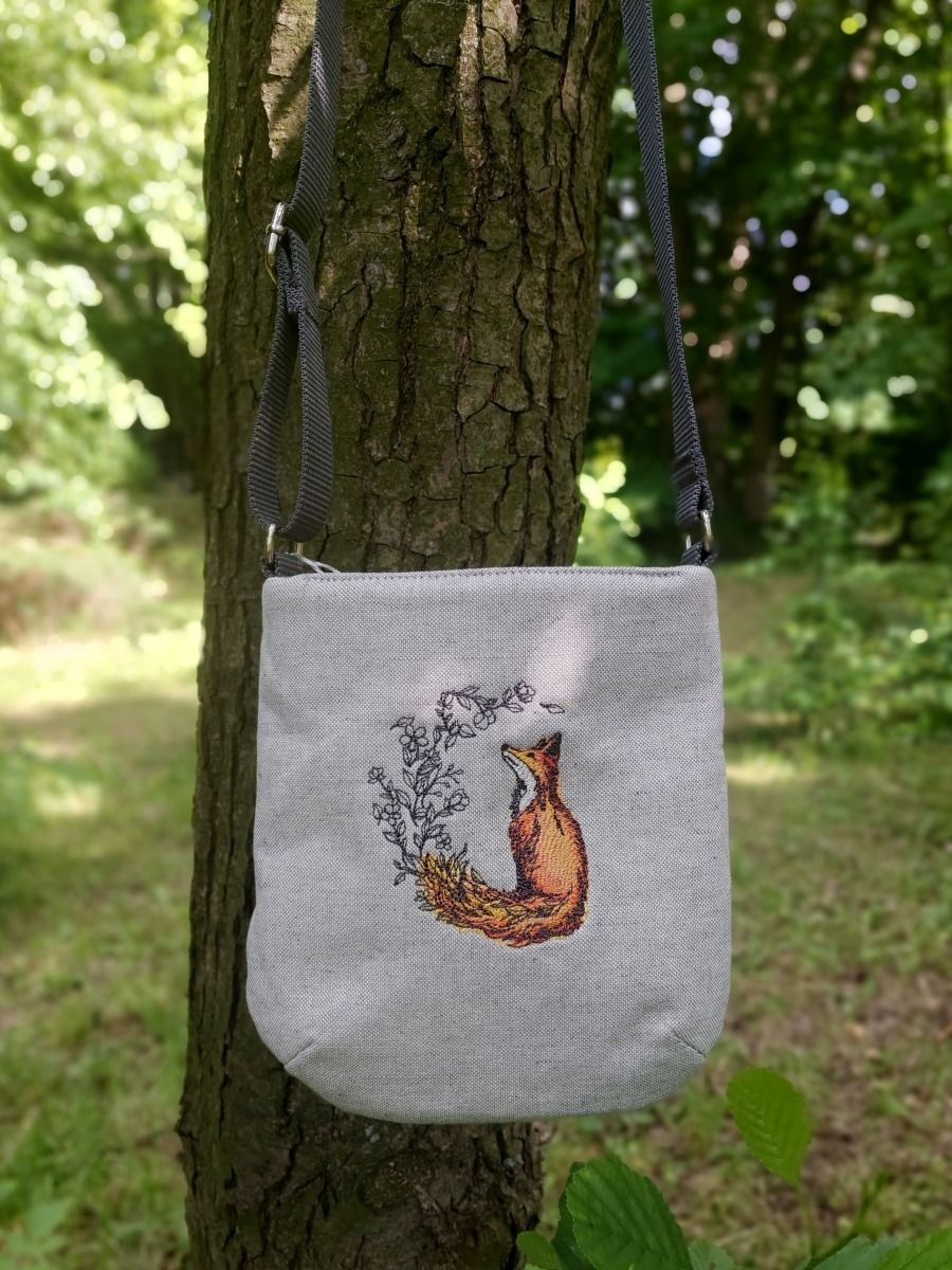 Kabelka drží díky pevné režné látce tvar. Podšívka je ze 100% bavlny s potiskem. Uvnitř je jedna kapsa a karabina na klíče.