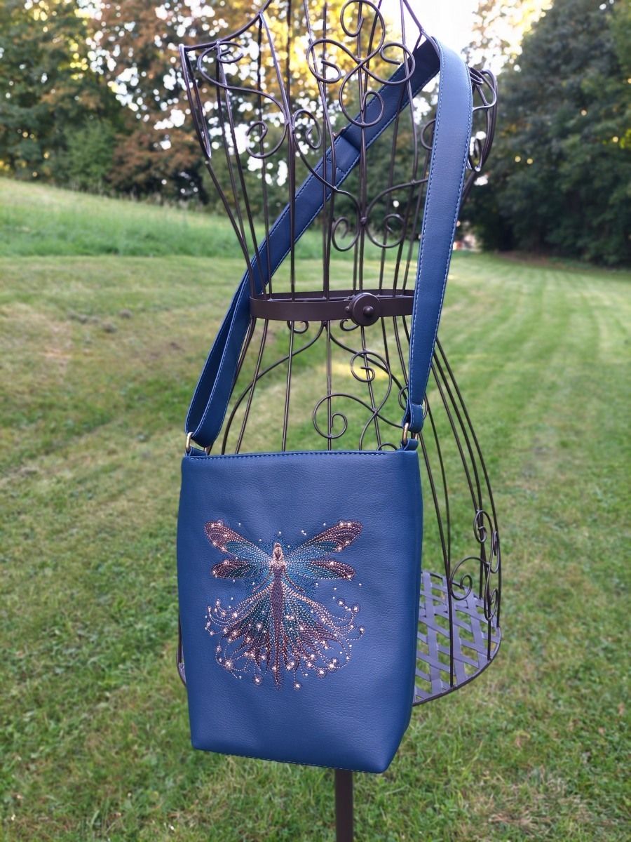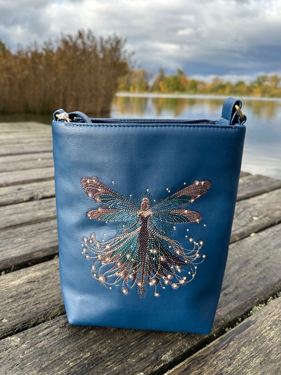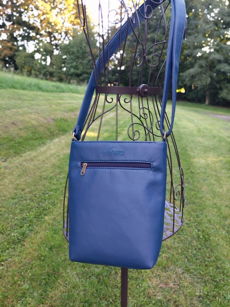 Kabelka je vyrobena z kvalitní tmavě modré pevné koženky, má zapínání na zip, kapsičku na zip na zadním díle kabelky.