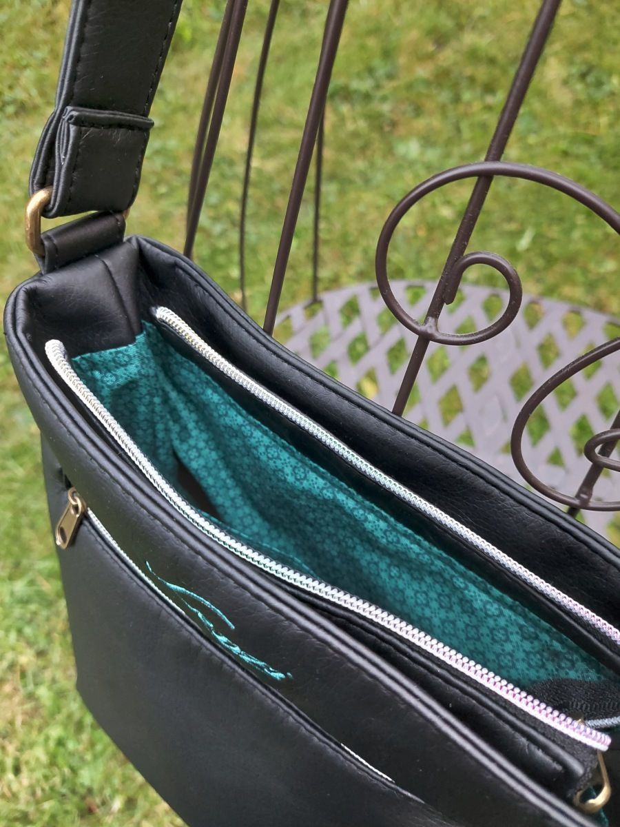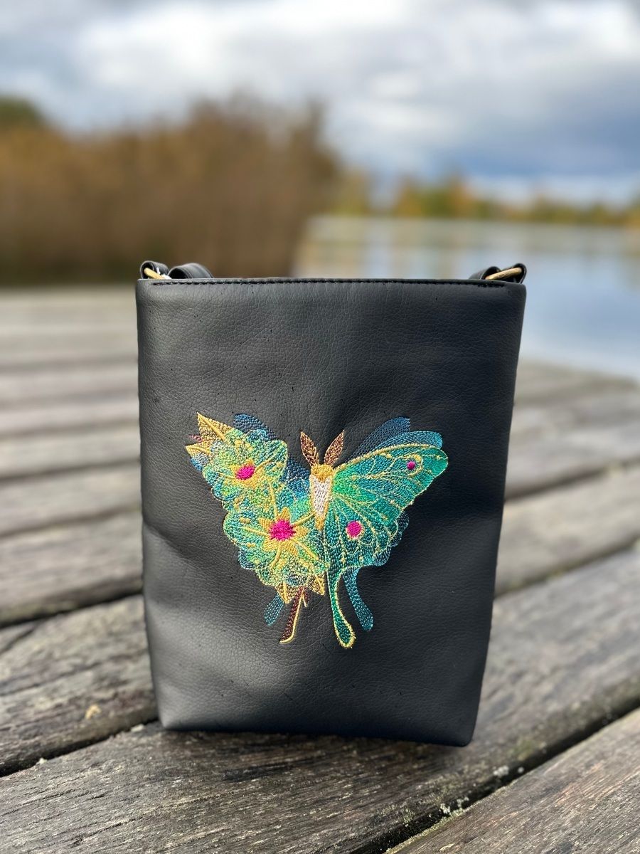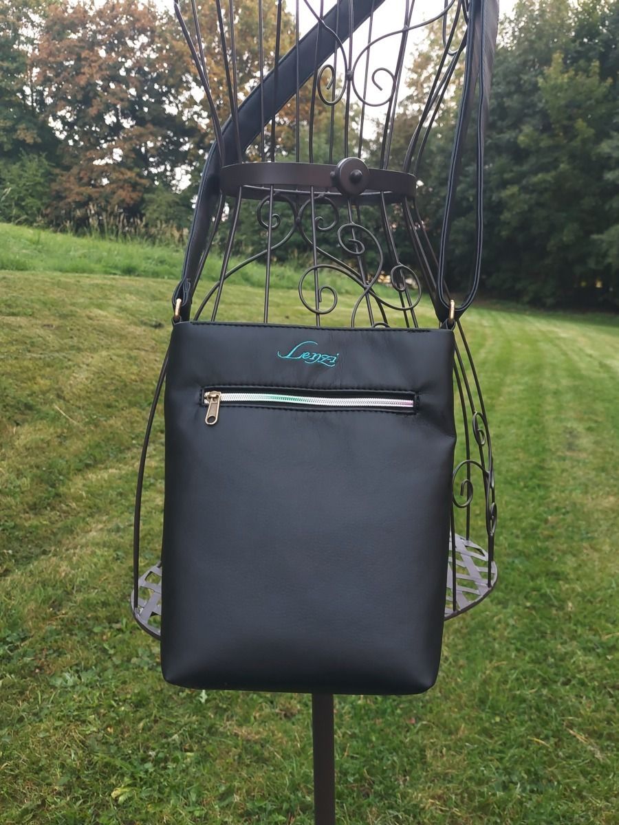 Kabelka je vyrobena z kvalitní černé pevné koženky, má zapínání na zip, kapsičku na zip na zadním díle kabelky. Výšivka je projasněna zlatou metalickou nití.